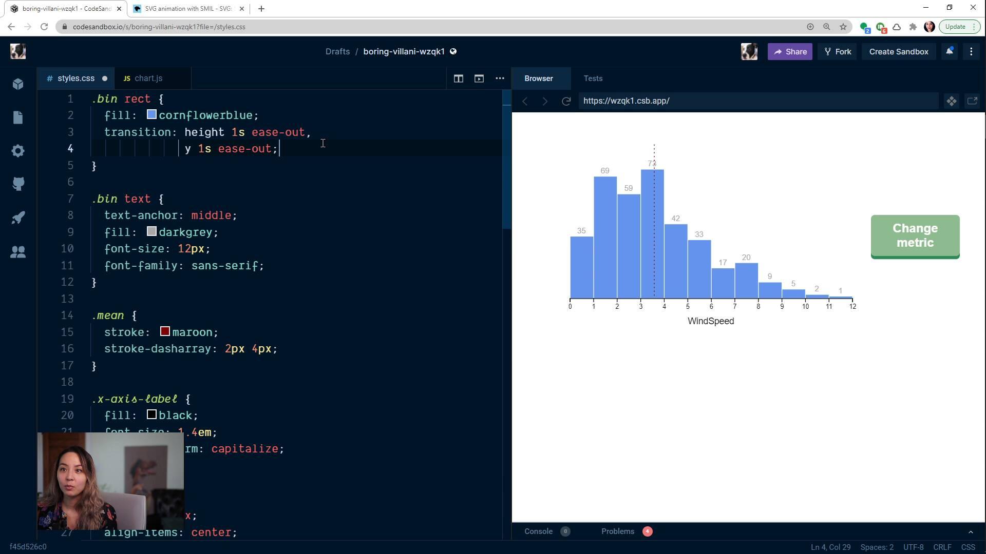 [06:00 - 06:14] So right now this first bar has this shorter height, and then if we hit change metric, it'll animate up to its new taller height. Let's actually slow this down.