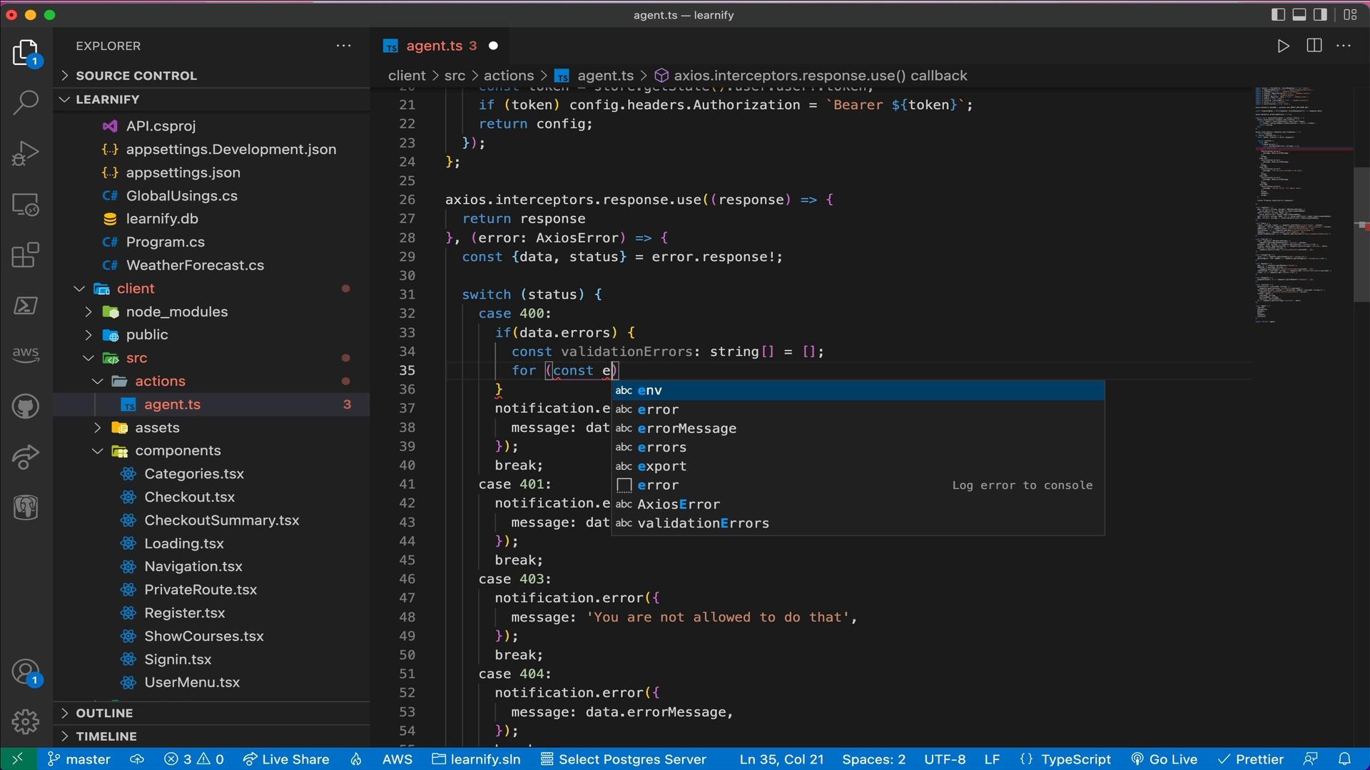 [08:44 - 20:54] Let's write lecture dto Now we can loop over the lecture sections for which we will use for off loop So let's write for and inside. Let's write const item of lecture dot sections Lecture item will then be equal to item dot lectures dot find now we want to find the lecture Which has the same ID as this so now let's make it lc Which will check if lc dot ID is equal to the current lecture, which is again an ID since it can be null we can again pass an exclamation mark Now if lecture item is there which means we have found that particular lecture now we will check if the lecture item is not null in this case we can dispatch Set current video to be lecture item dot URL And again we can pass exclamation here And after that we can finally return Now here, let's pass the dependencies which are current lecture dispatch lecture and history Now here what we are doing is we have the lecture, but we don't have the video when the user refreshes the page So what we are doing is with the lecture ID We are going and finding that particular lecture and setting current video to be the URL of that particular lecture And that's it and this will happen only when the user refreshes the page Otherwise when the user will click on that particular lecture It will automatically set current video to be the video of that particular lecture Now let's create another function When user will click on the new lecture in this case we want to send the current lecture ID to the Redux as well as to the database And we want to change the URL to the latest lecture ID So what we can do is after this use effect moving a little up so let's write the function called select lecture and as parameter we need ID of type number and URL of type string And since it's going to be an asynchronous function, let's write async here So we will call this function when the user click on that particular lecture So when the user does that first of all we want to history dot push the user To that particular lecture so to that particular ID After that we want to dispatch set current video, so let's write dispatch Set current video which will be the URL Also we want to make an API call which will set lecture inside the database as well so what we can do is write await and dispatch inside we can call set current lecture async function and as parameter we can pass lecture ID which will be the ID and Course ID which will be match dot params dot course We can now start writing the layout First of all if lectures loaded is false So we will check if lecture loaded it is false In that case we simply want to return the loading component. So let's write loading And that's it and inside the return statement we can first of all Start by creating a dev called lecture And we can divide our lecture into two parts We can keep the lectures sidebar to the left and the video player to the right now Let's start with the sidebar. So here. I will write lecture underscore side bar On top we will have the name of the course. So what we can do is we can create a class lecture Underscontersco sidebar Underscontersco Course this will basically the name of the course. So here we can use lecture dot course name and Here we need to put a curly bracket Now below this we want to loop over the sections and the lectures. So first of all, let's check if lecture is not null So if we have lecture In that case we want to loop over lecture dot sections. So let's go a little down and here Let's loop over the sections. So lecture dot sections dot map and Individual item will be called section and we also need the index. So let's write it here and from here we are going to return and Let's make a div here, which will be the base one and Inside div we will have key Which will have the value of index to make it unique Inside we can create the name of the section. So let's create a new div lecture Underscontersco sidebar Underscontersco section And here we can write the name of the section, which is simply section dot section name Now below this we can loop over all the lectures inside the individual section. So what we can do is Let's create section dot lectures dot map The individual lecture will be called lecture and we will also need an index And from here we will return a link. So let's import link We are using a link here because we will change the URL when we click on that particular lecture and to the link we will pass key, which will be the index And we also want on click event here. So let's write on click And when someone clicks on this lecture, we want to invoke the select lecture function, which takes id Which is the lecture id and URL, which is the URL of the video. So here we can call select lecture function and lecture id will be lecture dot id And lecture URL will be lecture dot URL And we want to highlight the selected lecture. So we can give it a dynamic class name So what we can do is we will write class name and check If lecture id is equal to match params lecture, so let's check lecture dot Id and let's make it string because our URL is always a string And this is equal to match dot params dot lecture And if it is true We want to give it a class name lecture Undiscondisco side bar Undiscondisco list Undiscondisco item Undiscondisco active So if the lecture id and the id inside our URL is same we want to highlight it And if it's not we can just copy it and remove active from here And we see an error because our link needs a two property So what we can do is we can send the user to the lecture id So let's use backtics And here we will simply send the user to lecture dot id Let's save it And now inside the link we will use an icon and the title of the lecture So inside we can create two spans the first one will carry the icon And the second span which will carry the title So here we can pass lecture dot title And for using the icon we will import faeikens So let's go on top And here let's import star as fa icons from react icons slash fa And inside our span we